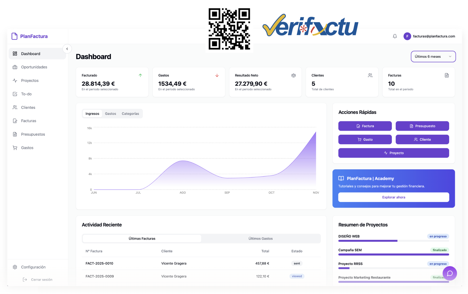 Por eso hemos creado una plataforma todo en uno, que no sólo genera y envía facturas con integración Verifactu, sino que te ayuda a organizar, crecer y escalar.